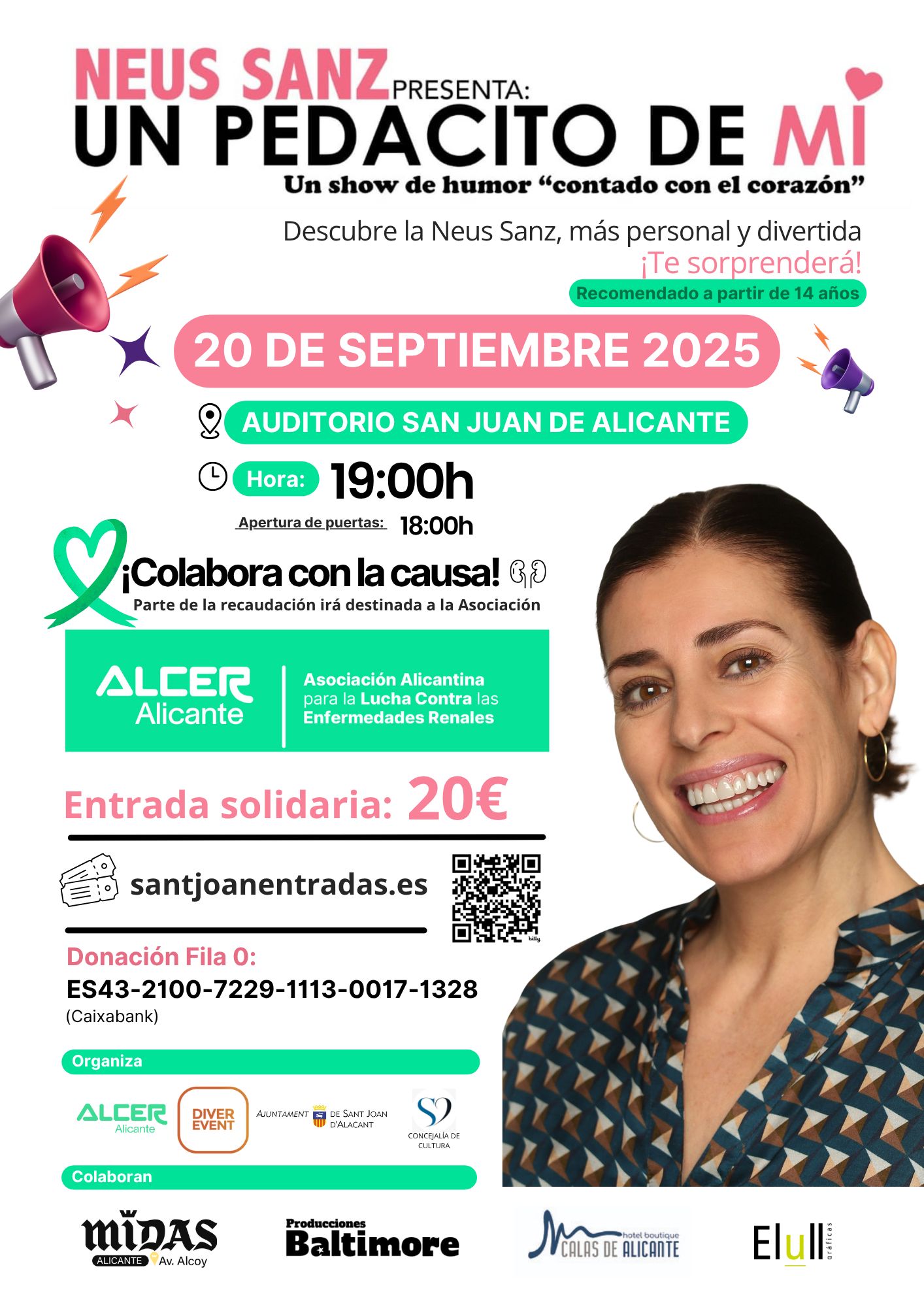 «Para ALCER Alicante, contar con el apoyo de artistas de la talla de Neus Sanz y con la implicación del Ayuntamiento Sant Joan d'Alacant y empresas colaboradoras supone un impulso enorme. Este evento es una oportunidad única para disfrutar del humor y, al mismo tiempo, colaborar con las personas afectadas por la Enfermedad Renal Crónica en Alicante», destaca Mª Carmen Román, presidenta de ALCER Alicante.