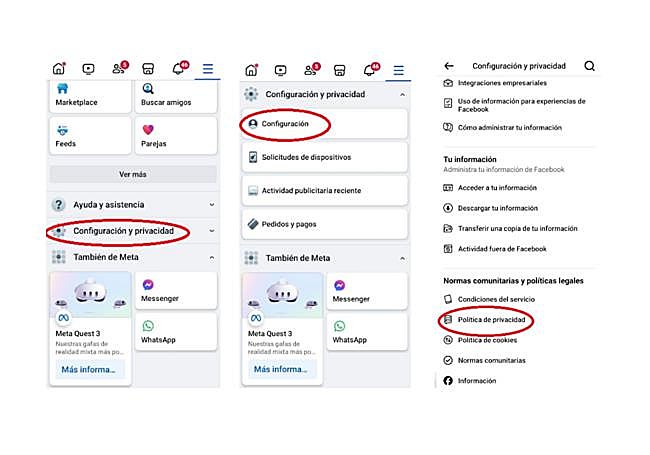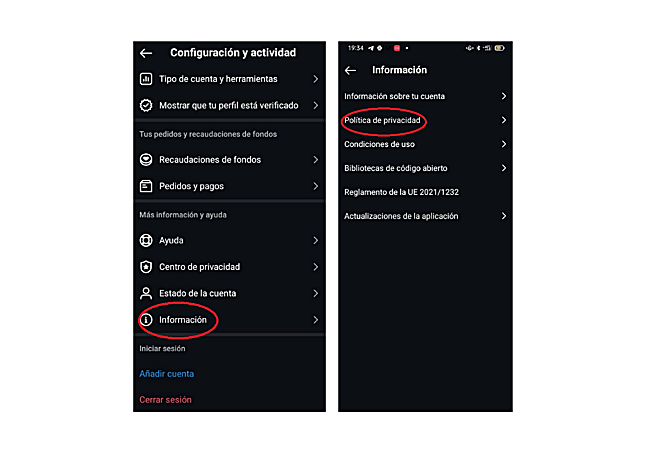 En tu móvil, dentro de la aplicación, pulsa en las tres rayitas de arriba a la derecha. Después, pulsa en 'Configuración y privacidad' y, a continuación, 'en 'Configuración'. Luego accede a la opción de 'Política de privacidad'.