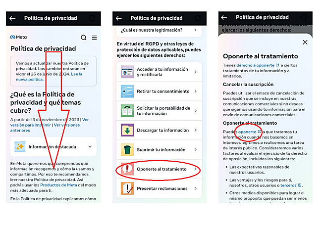 Cuando estés dentro del apartado de 'Política de privacidad', haz scroll durante unos segundos (no pocos) y pincha en la opción 'Oponerte al tratamiento'. A continuación, pulsa el enlace ubicado sobre la palabra 'oponerte'.