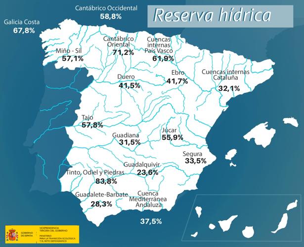 Los embalses que mayores subidas han experimentado por provincias son precisamente los de Cáceres (un 22% más de reservas hídricas), Ávila (12% más), Segovia (13% más) y Jaén, La Rioja y Badajoz (en torno a un 7% más). Se da la circunstancia de que ya no hay ninguna cuenca por debajo del umbral crítico del 20%. La del Guadalquivir, que hace una semana se encontraba a 19%, ya se sitúa en el 24%. Es la que menos agua almacena frente a las cuencas de Tinto, Odiel y Piedras (84%), Cantábrico Oriental (71%), Galicia (68%) y País Vasco (62%), que encabezan el listado como las que mejores niveles presentan.
